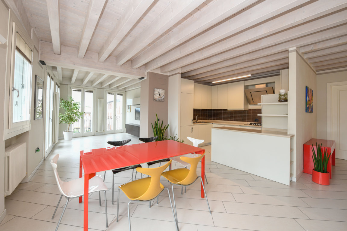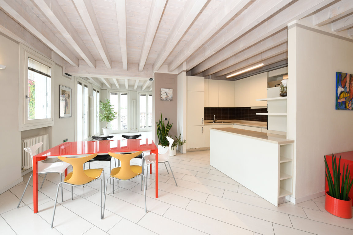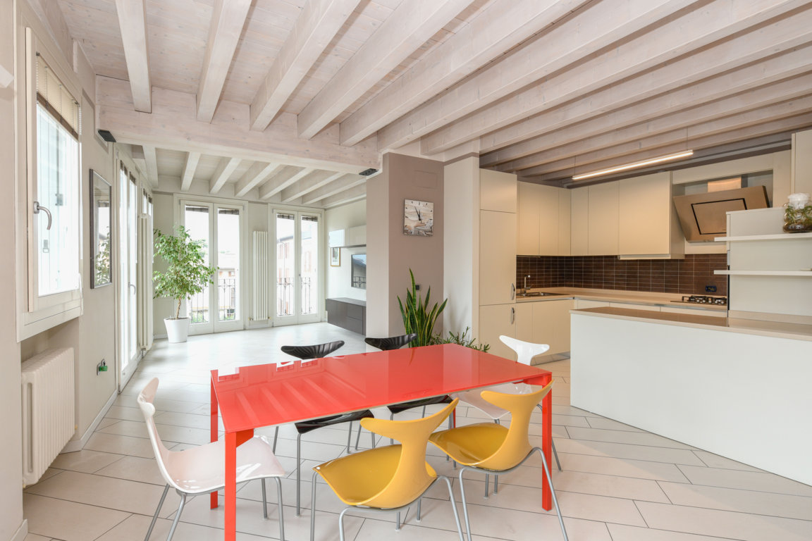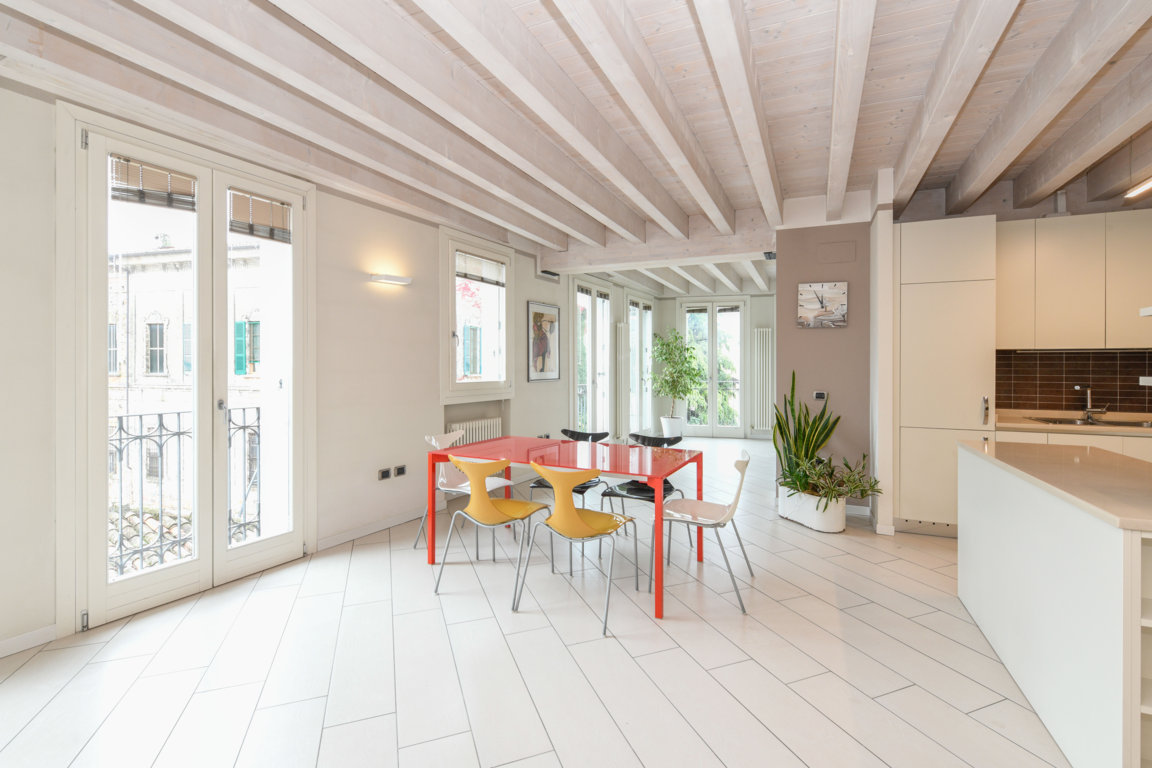 Tutte le stanze sono caratterizzate da soffitti in legno di abete decapato, che contribuiscono ad amplificare la luminosità degli ambienti.