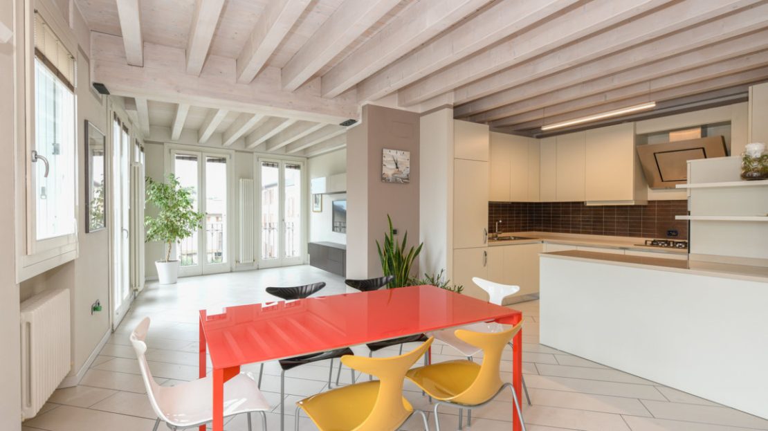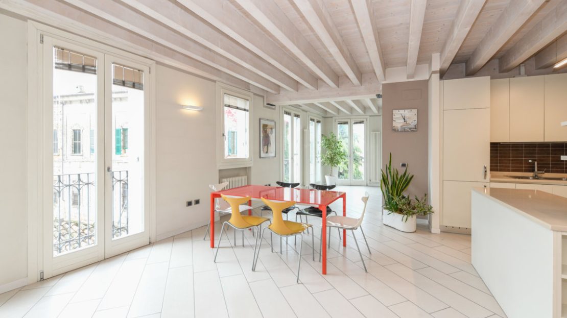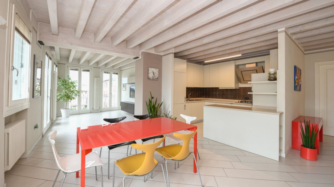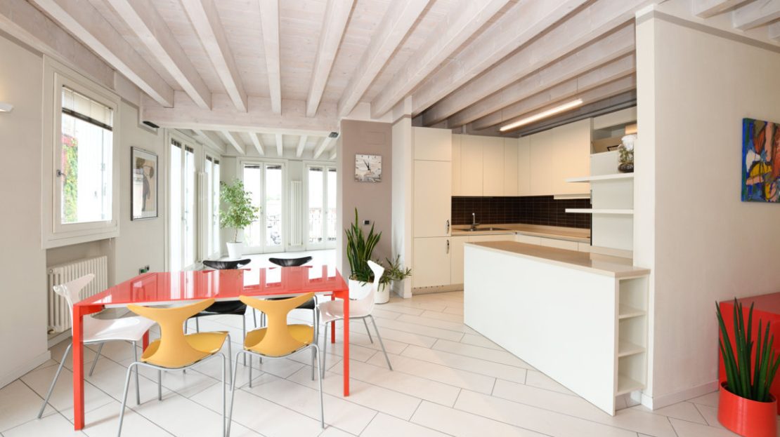 Tutte le stanze sono caratterizzate da soffitti in legno di abete decapato, che contribuiscono ad amplificare la luminosità degli ambienti.