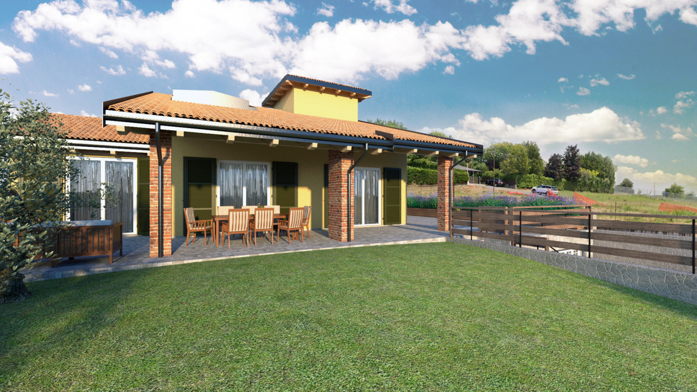 il piano terra è stato progettato per costruire una cucina abitabile, un soggiorno spazioso dove due ampie vetrate si affacciano sulla panoramica vista della pianura. In questo piano si possono ricavare due bagni oltre a due camere matrimoniali. Un ampio portico antistante il soggiorno permette di attrezzarlo con arredamento per il relax ed un tavolo per pranzare e cenare nelle belle stagioni. Questo piano ha una superficie di 140 mq.